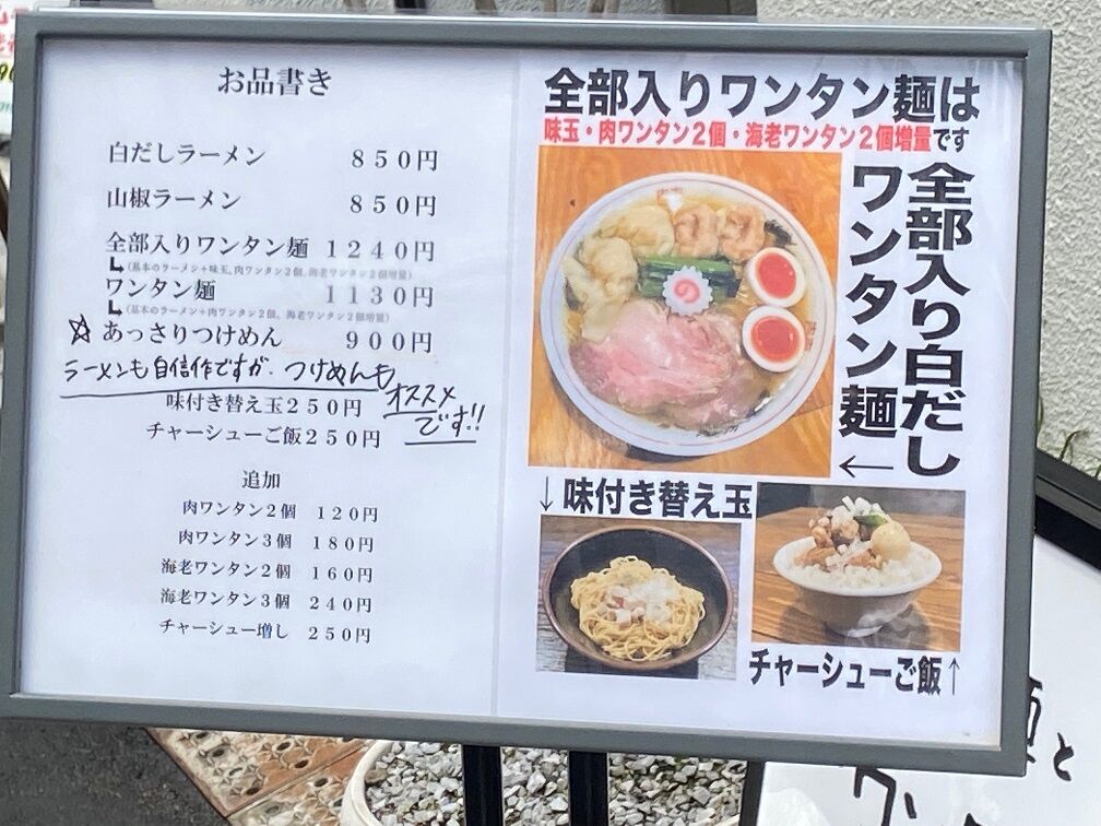 ※メニュー画像は訪問時(6/29)の物。 ラーメンは麺こそ違うものの、味は『中華蕎麦 にし乃』を踏襲してるようなので、今回は自信の新作という「あっさりつけめん(※現在は鰹昆布水つけめん)」を全部入りで注文。
