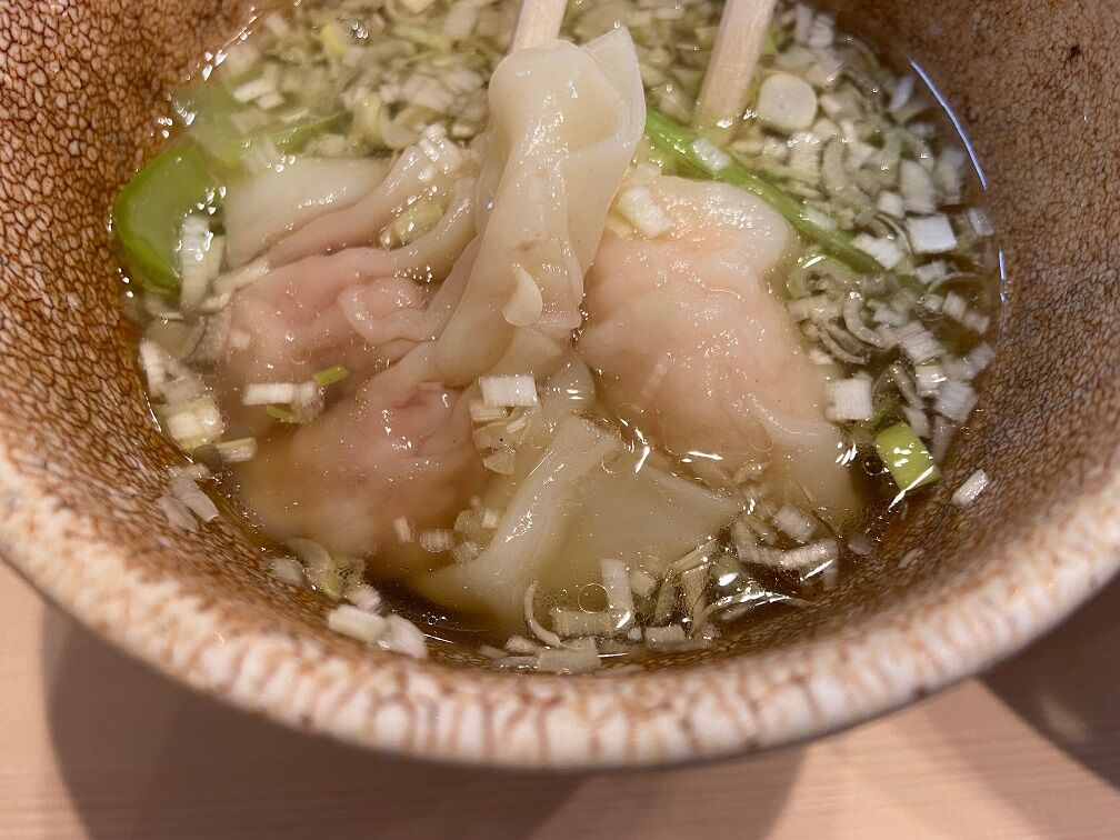 程なくして提供された「全部入りあっさりつけめん 1290円」 同時に「途中で味が薄くなったら足して下さい」と「出汁つゆ」「粗塩」が提供される。 「柄木田製粉」の「金龍」を使用し「キング製麺」で打たれたストレート細麺は昆布出汁に浸かっています。 透明感のある清湯つけ汁は白醤油だと思われ、ほのかに甘みがあり出汁感が凄い。 まずはつけ汁を付けずにそのまま麺だけを頂くと、小麦の風味と旨味が広がり、一緒に供された粗塩を付けて啜れば麺単体だけで十分に美味い! つけ汁に潜らせれば出汁の旨味と一体となり美味しいですね~♪ ワンタンは肉・海老ともに餡がタップリ! 後半つけ汁が薄まった所で「出汁つゆ」を入れば最後まで美味しく食べれる。