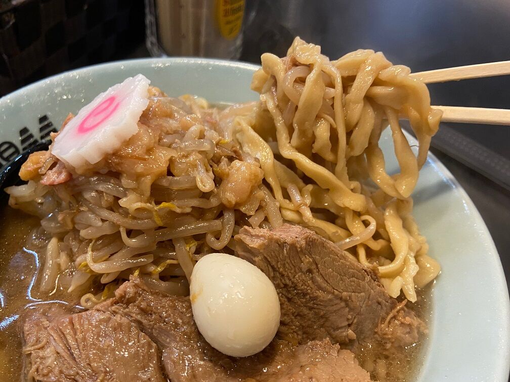 程なくして提供された「ラーメン(麺半分・生卵サービス)」は、大きくて肉厚チャーシュー2枚が鎮座し、スープで煮込まれたクタクタ系の野菜も十分な量。 国産豚100%使用の非乳化豚出汁スープは、パワフルながらも素材の旨味が引き出され、ほのかな甘みとコクがあって美味しい。