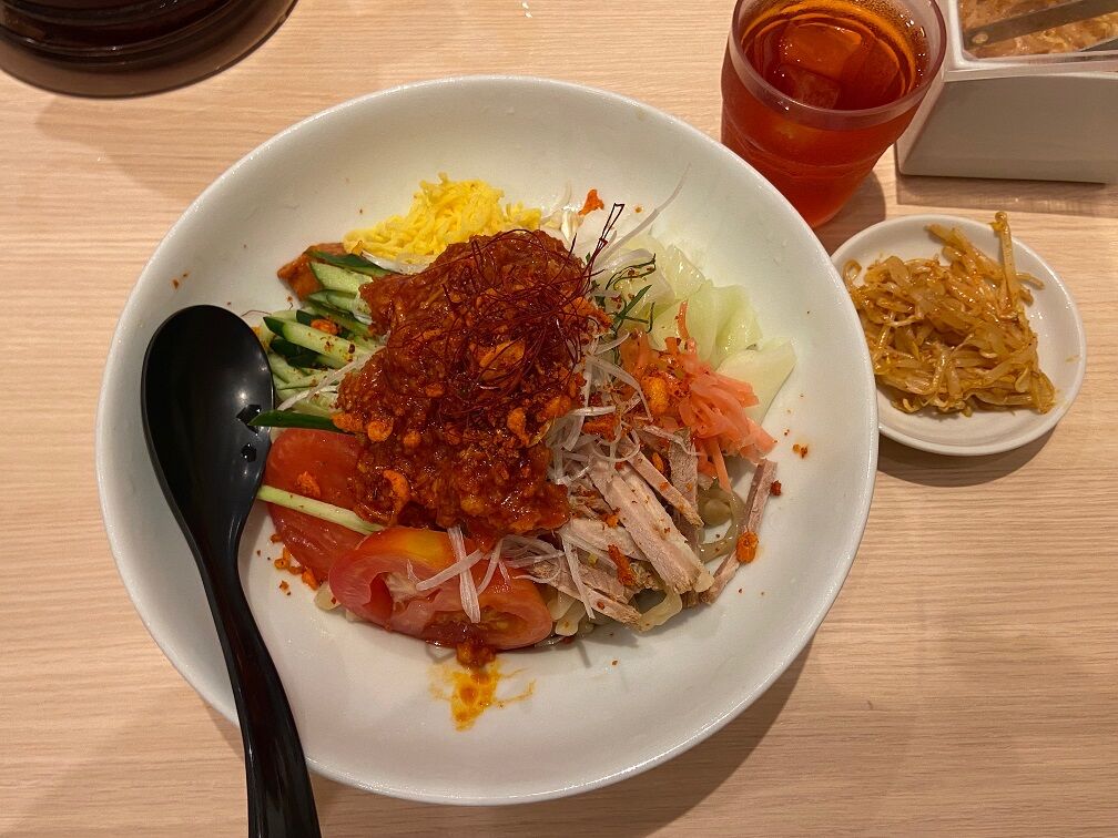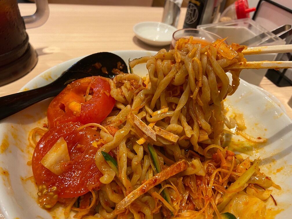 合わせる麺はひんやりと締められたモチモチの極太麺。 300gほどはあろうかボリュームもあり、少し酸味のあるピリ辛ソースが食欲を刺激する。 しかしソース味でない分「もんじゃ」とはかけ離れた印象で、豚骨ベースの美味しい冷やし辛味まぜそばといった感じ。 トッピングも豊富で食べ応えがあり、暑い季節に元気が出るような美味しい1杯でした。