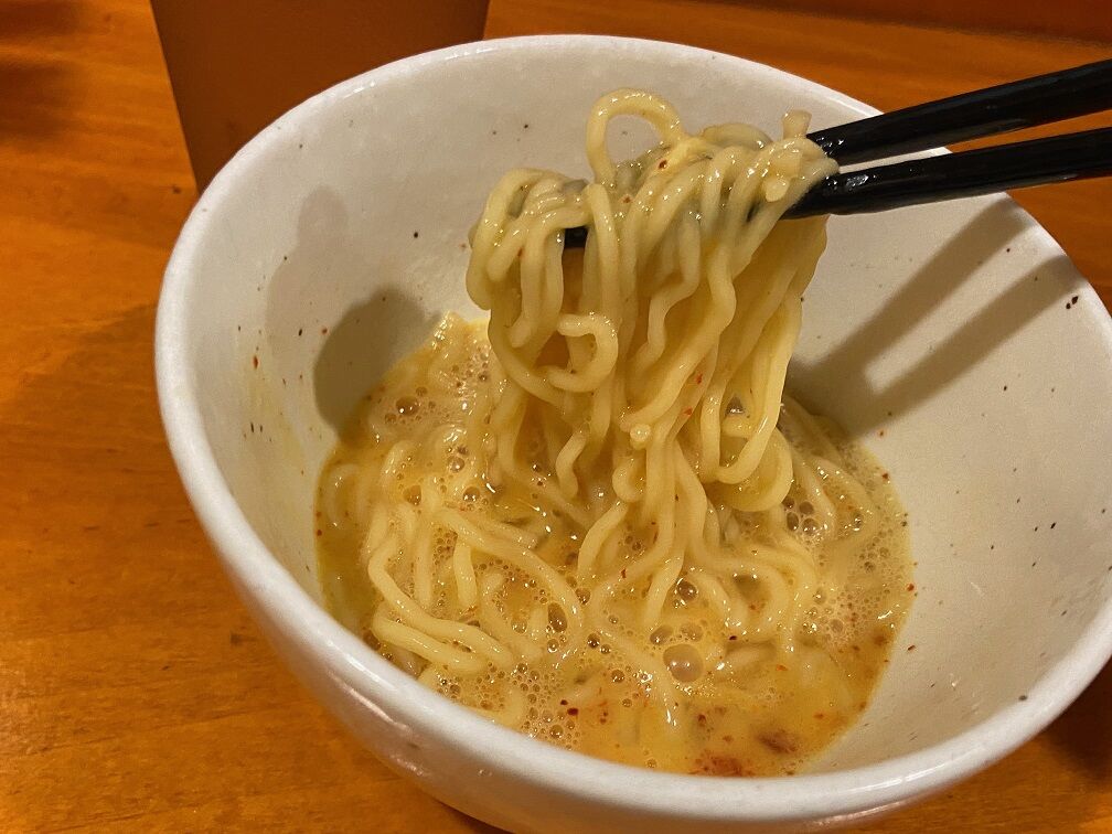 合わせる中細縮れ麺はプリッとした食感で喉越しも良く小麦が香り、縮れ具合も煮干しスープに合っており、300gもスルスルといけてしまう。 これを「永福町大勝軒」の食べ方でもある生卵と絡めて食べればメチャ旨っ。