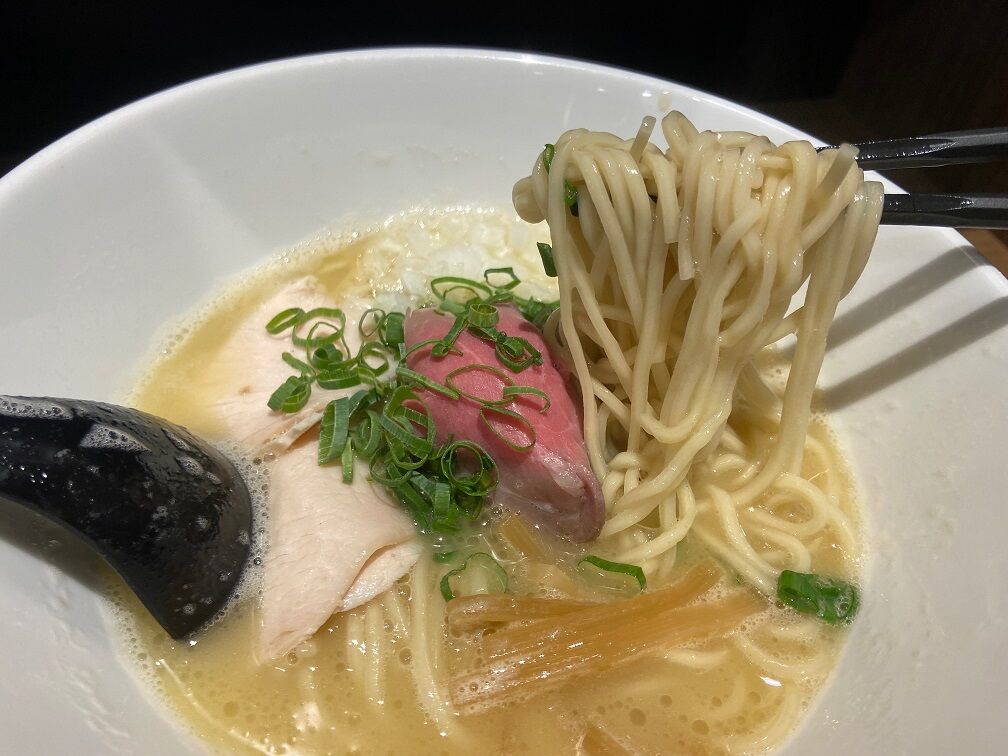 程なくして提供された「鶏ゅ白湯らーめん」 スープは鶏の旨味が凝縮された濃厚鶏白湯に白と黒のトリュフオイルを合せたもの。 クリーミーでポタージュスープのような仕上がりでトリュフが香る。