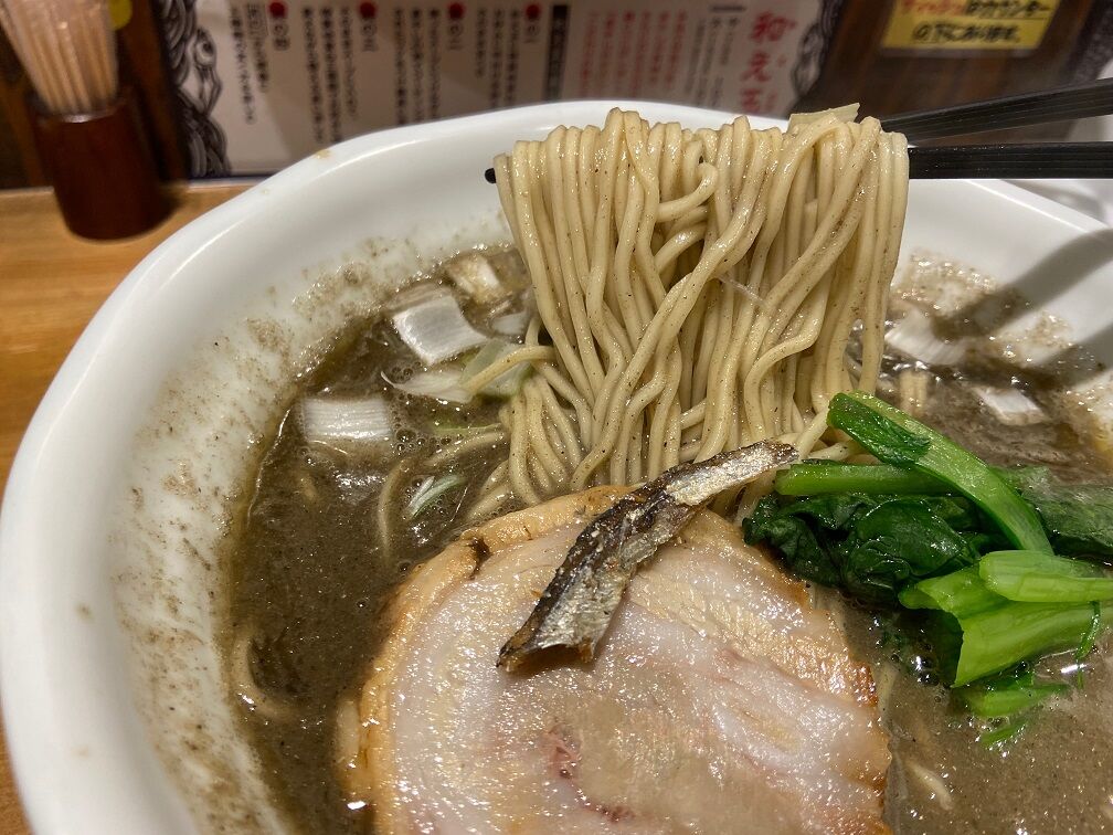程なくして提供された「瀬戸内煮干しラーメン ゴクニボ」 ドロっと粘度のあるスープは「瀬戸内煮干し」をすり潰して作られたとされ無化調の濃厚煮干しスープ。 動物系スープが不使用なので凝縮された煮干しの旨味と風味がガツンとくる。合わせる麺は「菅野製麺」の中細ストレート。 パツパツ系ではなくしっとり感も兼ね備えた麺で煮干の旨味がしっかりと絡む。 卓上に置かれた「追いいり粉」「いりこ酢」「いりこ一味山椒」なる調味料類での味変もなかなかだ。 2軒目でなければ「和え玉」も発注してたな。 美味しく完食。