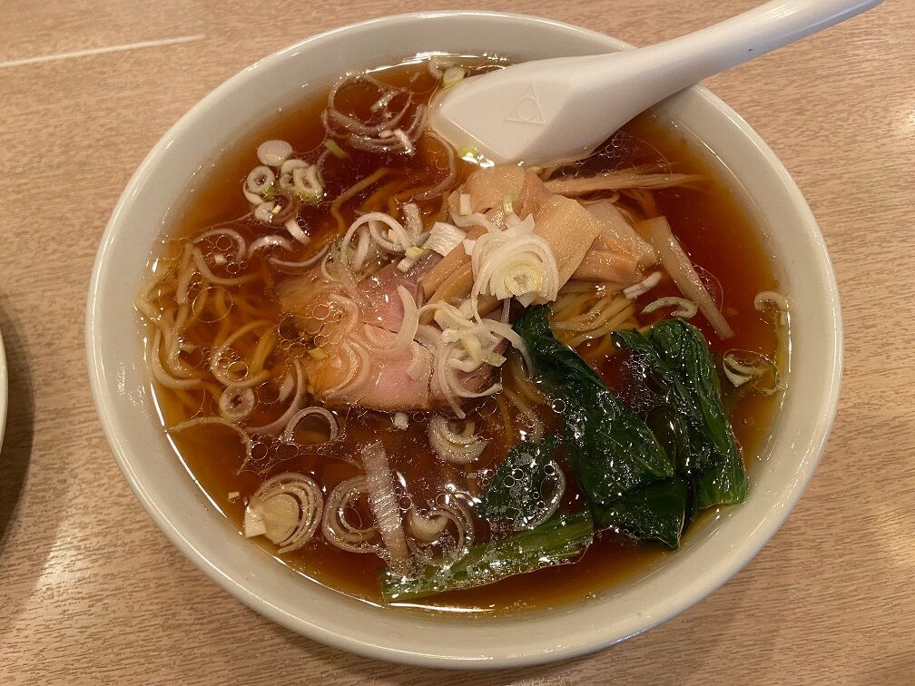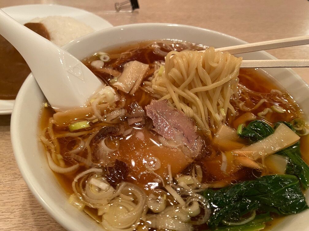 提供された「ラーメン&カレーセット」 鶏ガラや野菜などを煮込んだスープにチャーシューの煮汁を加えた清湯醤油味。 シンプルで優しい味わいは、郷愁にかられる懐かしい醤油ラーメン。