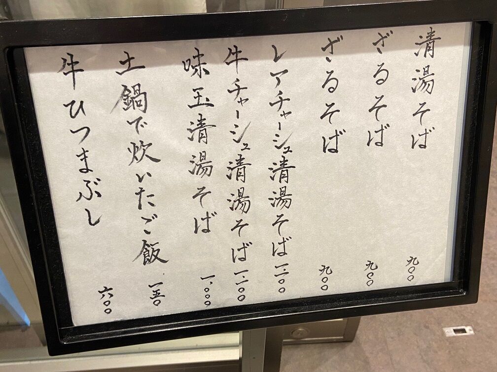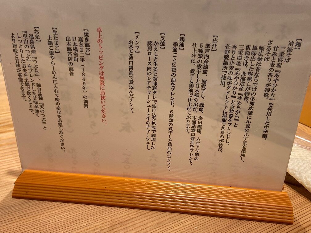 後半は生卵を加えての味変。 卓上に調味料がないのが残念でせめて一味が欲しかった。 スープがとても美味しくて余韻に浸れる美味しい1杯。 粗びき麺or平打ち麺とが選べる「ざるそば」も美味しそうだな。
