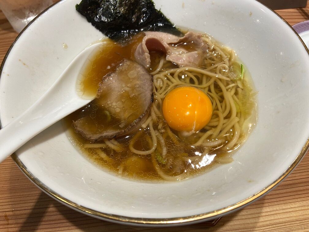 そして提供された「清湯そば」 清湯醤油味のスープは、5種類の煮干しと日本橋出汁店の鰹出汁、本醸造濃口醤油のタレに香味油は煮干鶏油。 優しく煮干味が効いておりクセもなく沁み入る味わいで美味しい。