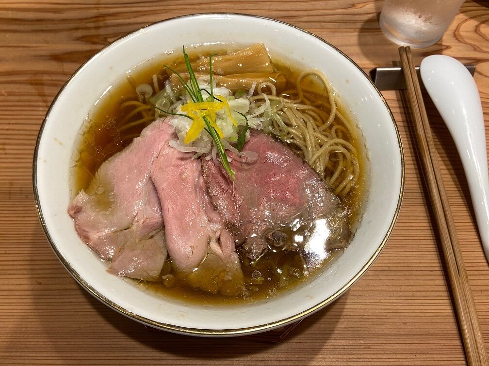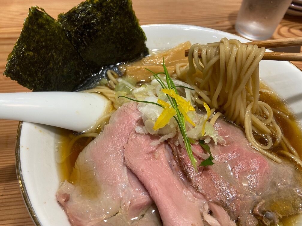 麺は菅野製麺所製の中細ストレート。 風味が良く個性のある食感が特徴的。 低温調理の豚肩ロースチャーシューと牛チャーシューも大振りで食べ応えもあり、お茶と薄口醤油で煮込んだとされる極太メンマも美味。