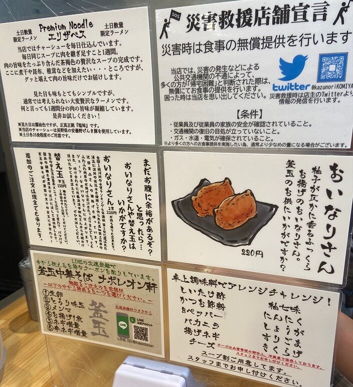 注文は基本メニュー「釜玉」にチャーシューとメンマが入る「リッチ釜玉 790円」 トッピングにお揚げに味玉が入った「玉袋 200円」プラス。 更に「おいなりさん 220円」もお願いした。