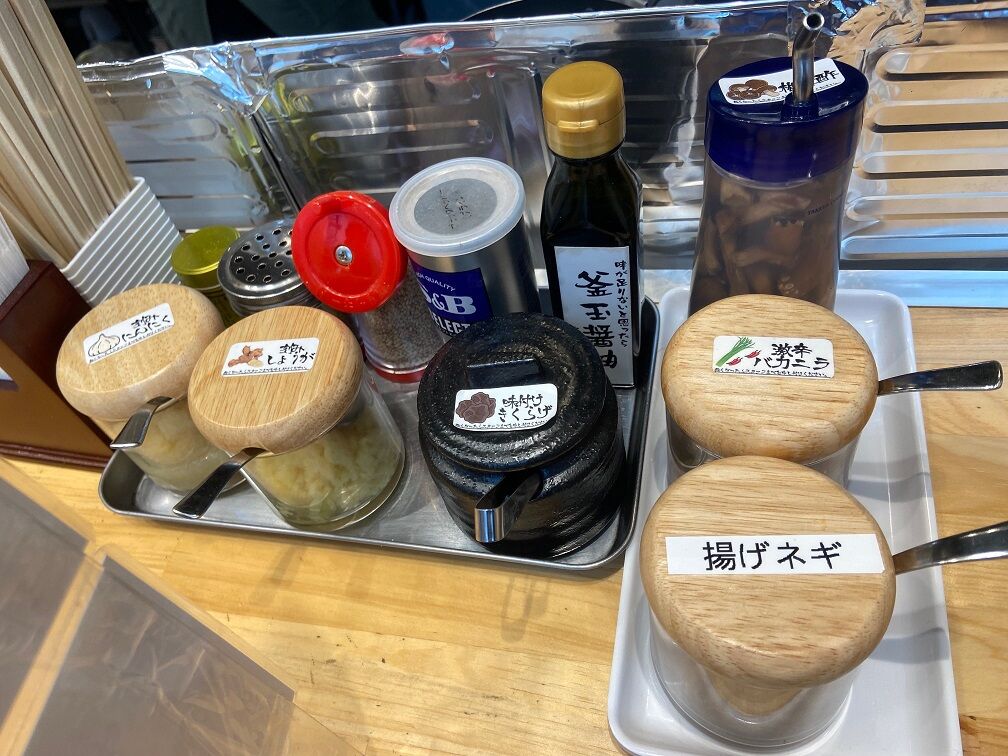 途中で卓上に置かれた豊富な調味料での味変も実に楽しい。 今回は「激辛バカニラ」と「椎茸酢」を選んだが、色々なバージョンが試せて面白そうだ。