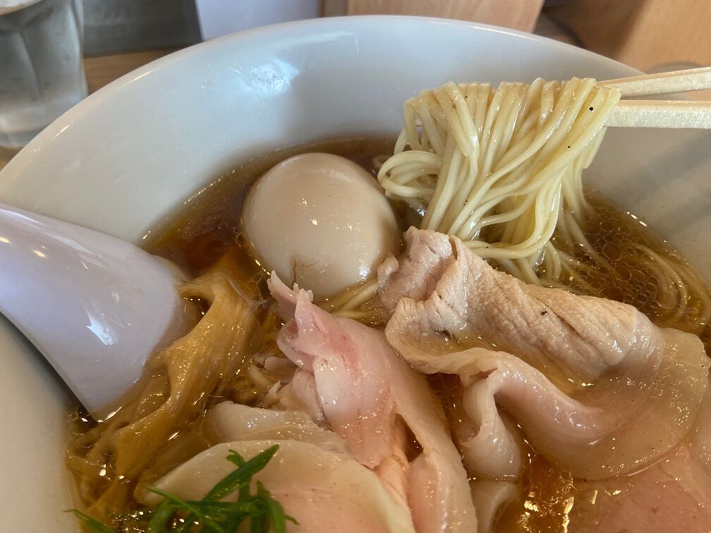 スープは「水鳥糸」と言われる鶏と水のみを使用した清湯醤油味。 鶏の旨味が十分に出たスープに醤油のキレと鶏油のコクが合わさりハイクオリティの美味しさ。