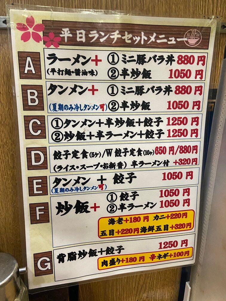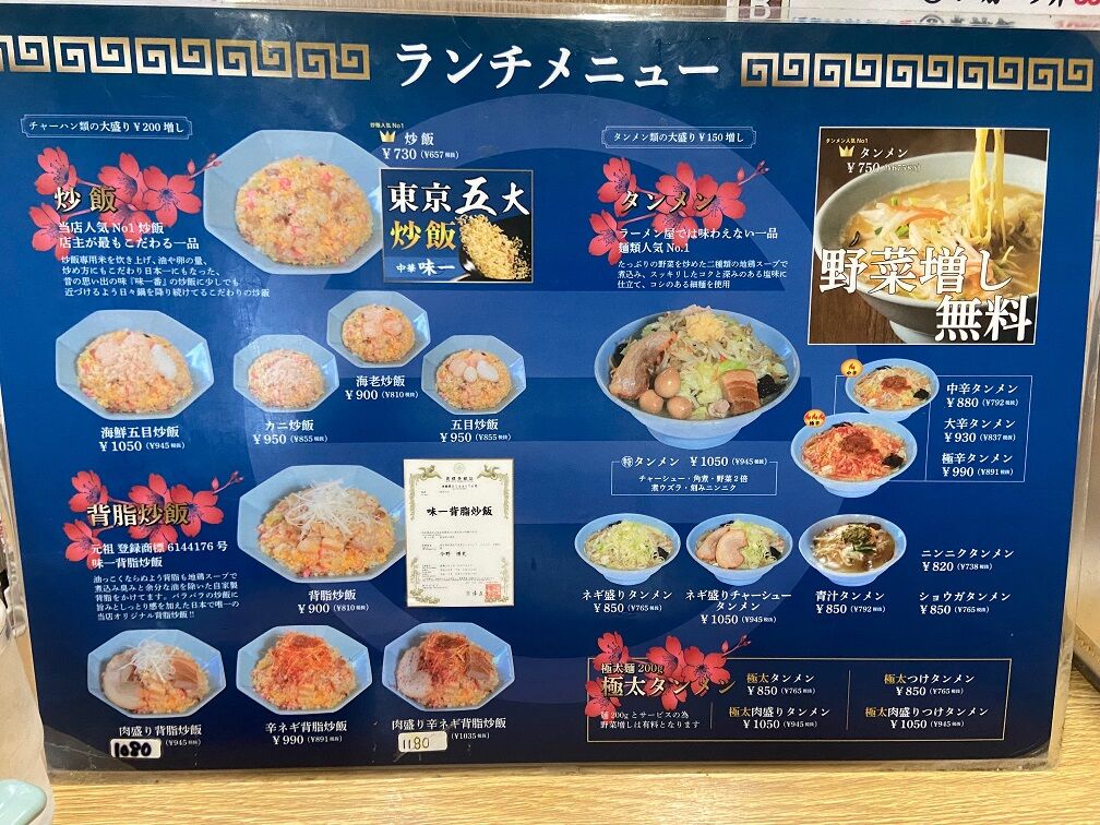 こちらはタンメンや炒飯が人気で、特に炒飯は「東京五大炒飯」なるものを謳っている。 注文はタンメンと半炒飯の「ランチセットB」