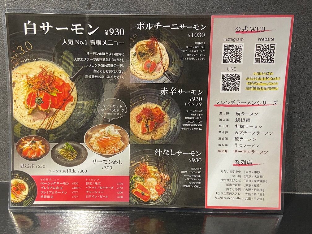 今年1月オープンのこちらは『ただいま変身中@中野』の系列店。 他の系列店はそれぞれ鯛・牡蠣・蟹・雲丹などをメインにしたラーメンを提供しており、今回のお店はフレンチ歴14年のシェフが作るサーモンを使ったラーメンを提供。