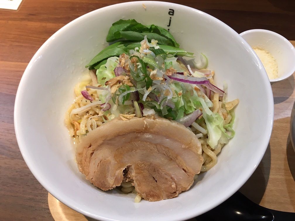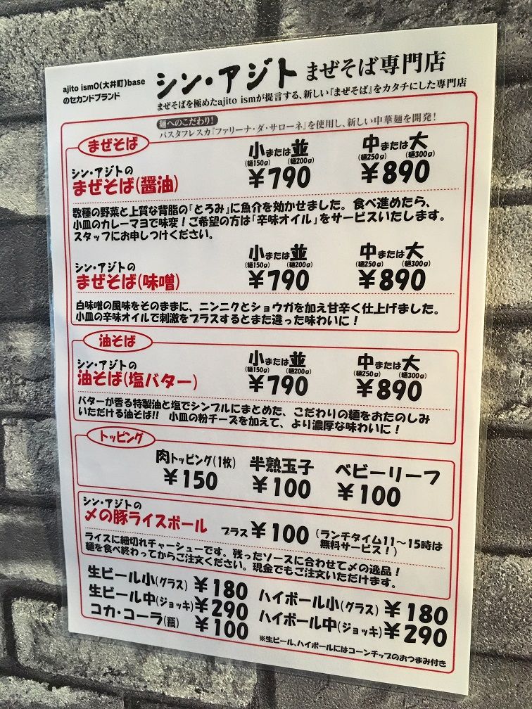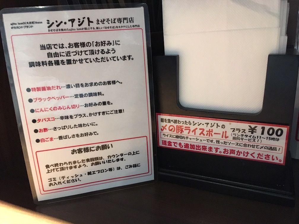 メニューを見ると新宿で提供していた本店メニューのピザソバ・カルボナーラ・つけ麺などはなく、「まぜそば(醤油・味噌)」と「油そば(塩バター)」の3種と限定に一新。 オーダーは先頭メニューの「まぜそば(醤油)」ではなく、塩バター味が気になり「油そば(塩バター) 」の並盛とランチタイム無料の「〆の豚ライスボール」を注文。