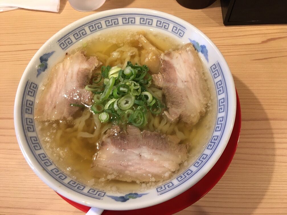 程なくして提供された「会津山塩物語」 塩味のスープはクリアで透き通り、表面には背脂が軽く浮きイイ感じ。 説明書きによれば高濃度温泉水を薪窯で煮込んだ「会津山塩」「会津地鶏」「6種の貝出汁」を合わせたとのこと。 塩加減はやや控えめで出汁感を楽しみながら味わう感じの、じんわりと優しく染み渡る美味しい淡麗スープ。