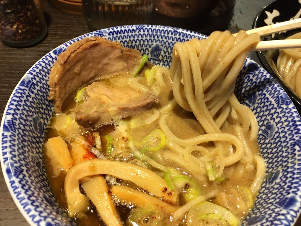 麺は浅草開花楼製の全粒粉入り太麺。 程よくコシがあってさすがの安定感。 ドロっとした濃厚な動物魚介系のつけ汁は、ピリッと花椒が効いていますが痺れはさほど強くない。 そこでミル入りの花椒を挽いて痺れを増すと、重厚なつけ汁と痺れ感が調和して美味しい!
