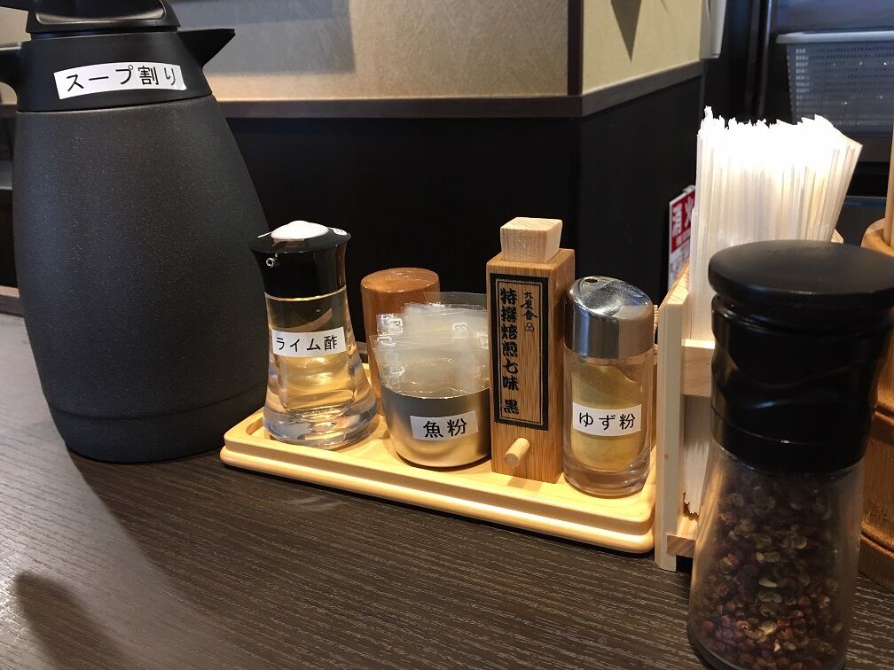 後半は卓上に置かれた特選焙煎七味黒・ライム酢・ゆず粉・魚粉と豊富な調味料で味変を楽しむ。