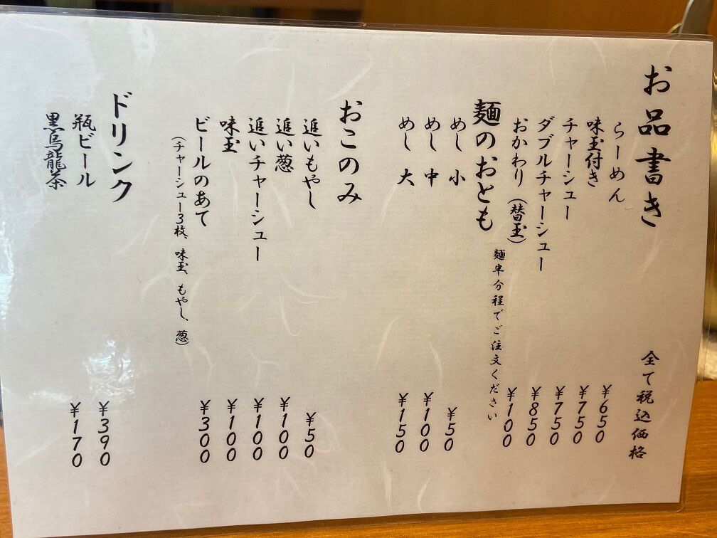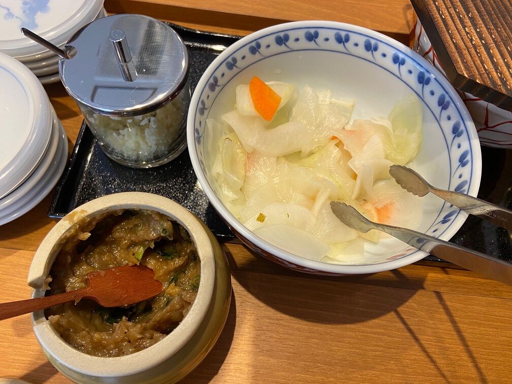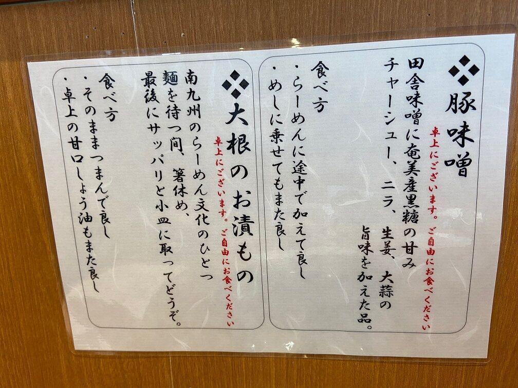注文は「チャーシューめん 750円+追い葱 100円+めし小 50円」 事前に麺の茹で具合が柔らかめだと聞いていたので麺カタでお願いました。 そして提供されるまでは卓上に置かれた大根の漬物をポリポリとつまみながら待つのが鹿児島流。 一緒に置かれている鹿児島の郷土料理「豚味噌」はらーめんの味変とご飯のお供までお預け。
