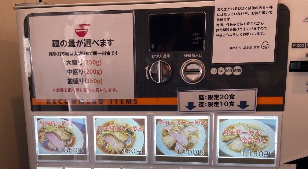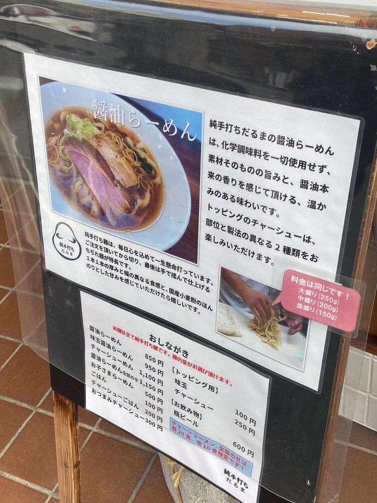 注文は「味玉醤油らーめん 950円」と「チャーシューご飯 200円」 そして麺の量が大盛り250g・中盛り200g・並盛り150gから選べて全て同料金。 せっかくなので大盛りでお願いしました。