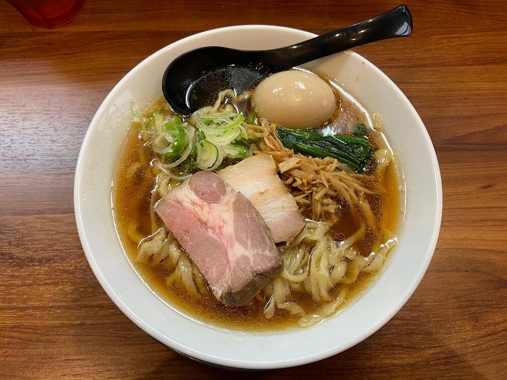 程なくして提供された「味玉醤油らーめん(大盛り)」 輝く醤油スープは鶏ベースに節系が効いた無化調の和風出汁。 数種の醤油で配合されたカエシに、香り付けの特製油の風味が広がる。 じ~んわりと優しく染み渡り、味わい深くて美味しいですね~!
