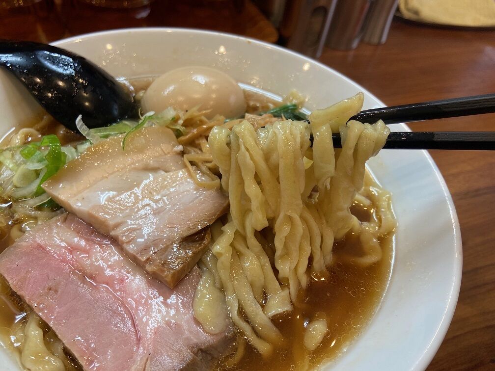 合わせる麺はみずみずしい自家製の中太平打ち縮れ麺。 あらかじめ手打ちされた麺帯から、注文ごとに切り出し手揉みされたモッチモチ麺。 1本ずつ幅と厚みが違うため口に運ぶごとに違った口当たりと食感が楽しめる。 豚バラと豚モモ肉の2種類のチャーシューもそれぞれ違った旨味が味わえる。