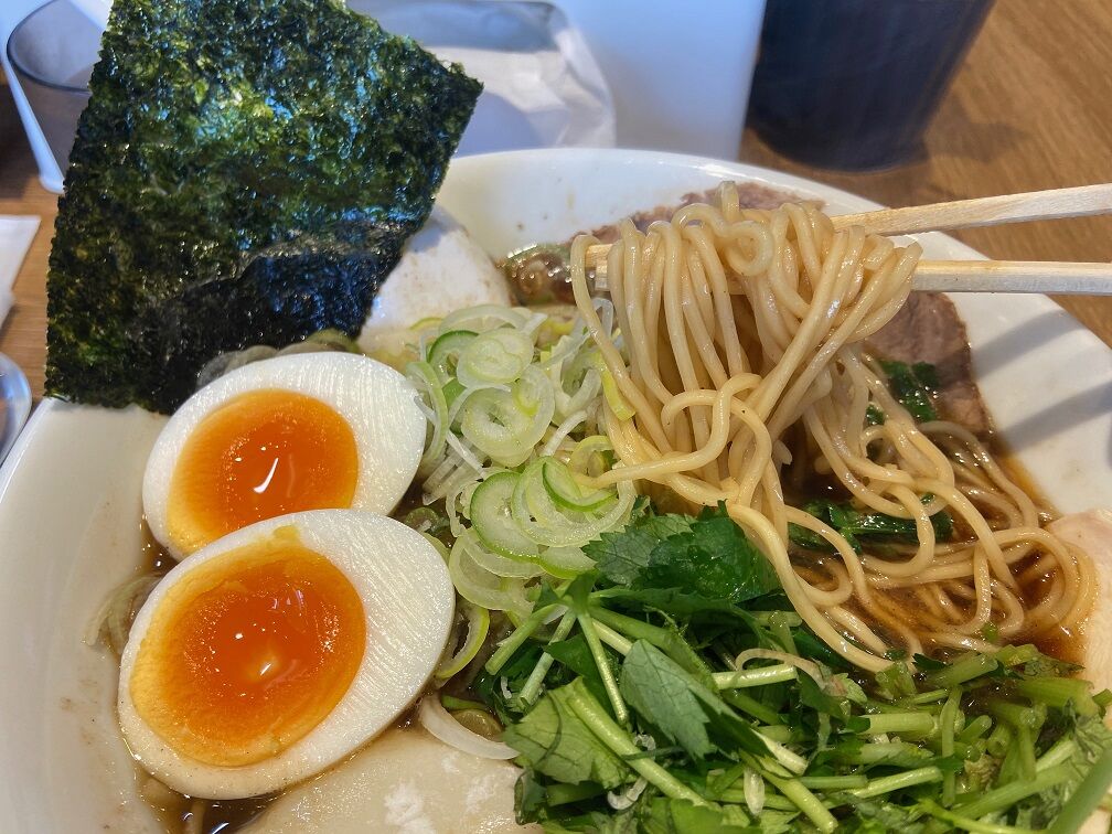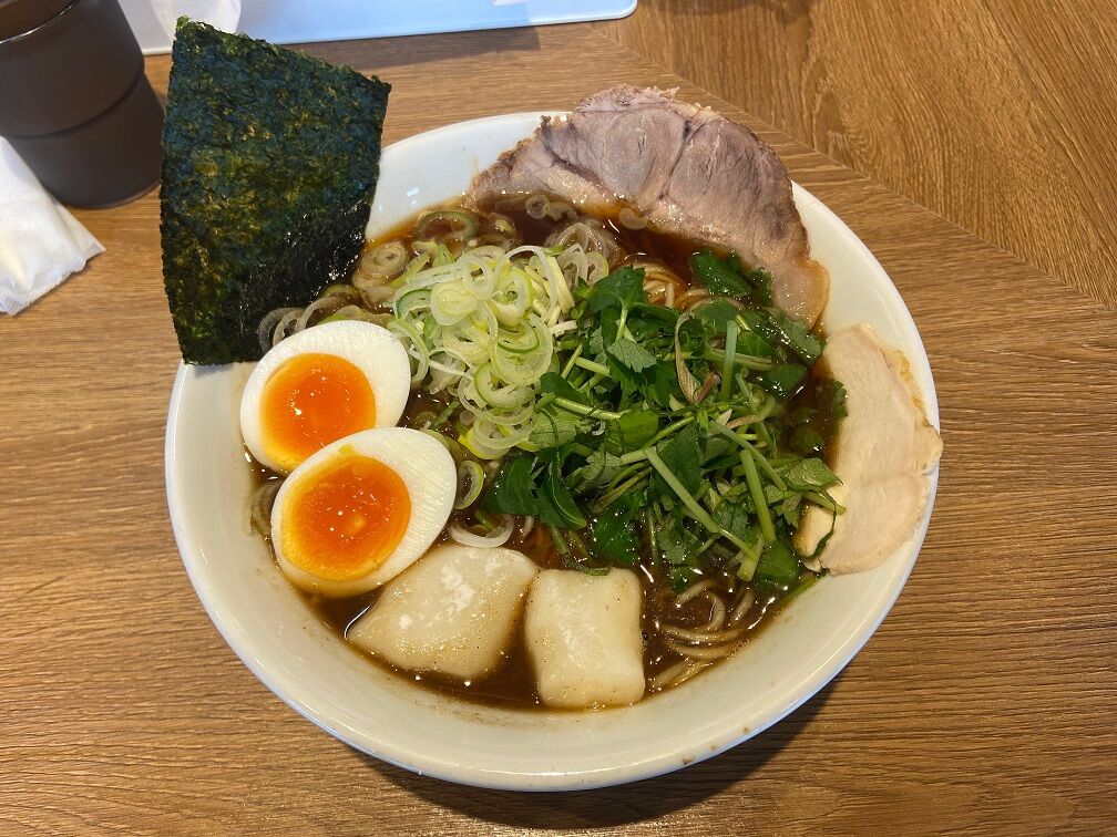 合わせる麺は中細ストレート麺。 程好くコシがありツルツルとイケるタイプでスープとの相性もいい。 低温調理されたしっとり鶏チャーシュー、しっかり味付けされた三元豚のチャーシューも美味い。 素揚げされた自家製の生餅トッピングは醤油スープとの相性がバッチリ! 逆に三つ葉の風味が強過ぎたなのが気になったな。 具沢山でこの価格設定は食べ応えもあってCPもイイですね。 醤油にこだわりオリジナリティ溢れる上質な美味しい1杯でした。