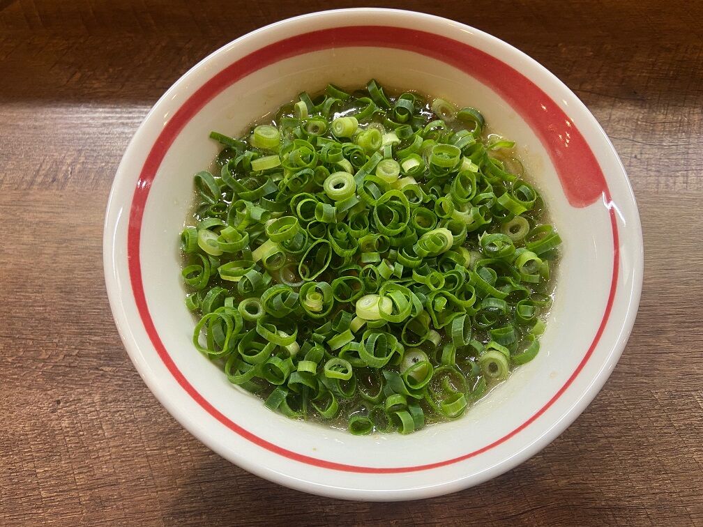 程なくして提供された「定番ネギラーメン」 丼一面にドッサリと敷き詰められるのは、契約農家から直送される九条ネギ系の一種「緑宝黒葱」 スープはややクリーミーで滑らか口当たりの豚骨醤油味。 国産の豚骨を二日間煮込んだとされ、旨味とコクがタップリと引き出されており、豚骨臭もなくカエシはやや濃いめ。