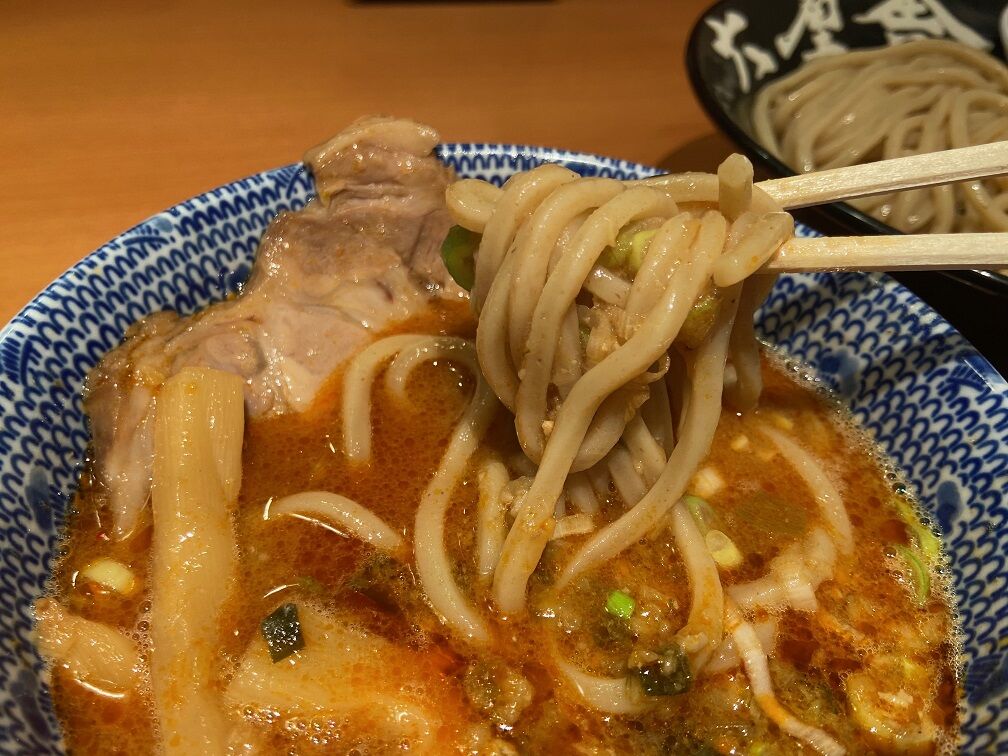 程なくして提供された「六厘舎 特製餃子つけめん」 まずは気が付くのは餃子の姿がない事。 コンセプトは「餃子はないが餃子の味が楽しめるつけめん」なんだそう。 デフォの豚骨魚介スープのつけダレに浮かぶ挽肉入りのラー油。 そのラー油を混ぜればつけダレが餃子風味に変身。