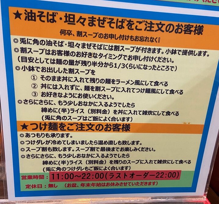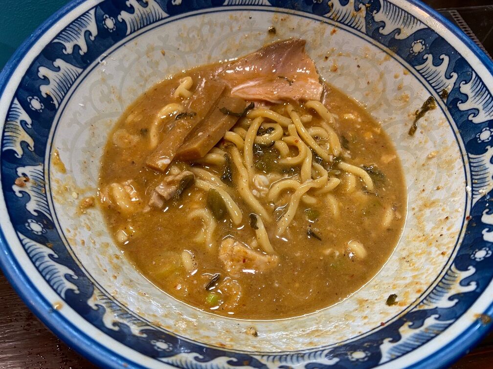 ガツンと魚介の効いたスープを投入してラーメン風にして完食。 辛さと痺れがやや物足りないが「担々風まぜそば」として頂けば十分に美味しい1杯。 次回は未食の牛スジ丼にトライしてみたい。