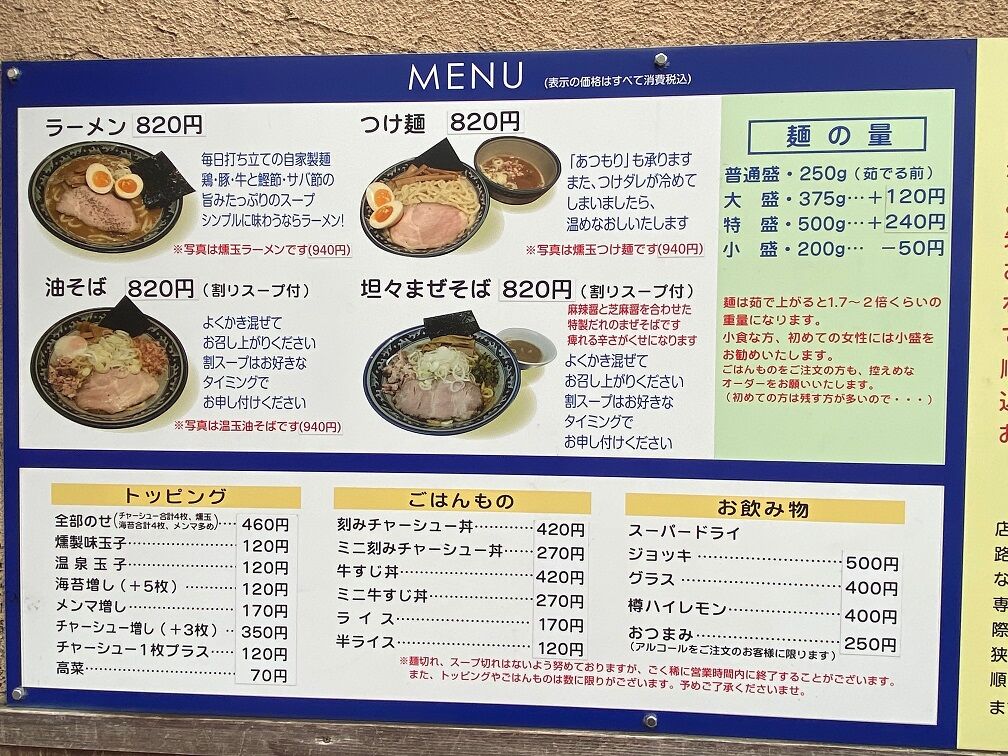 注文は12年前には無かった「坦々まぜそば 820円」+「温泉玉子 120円」にしました。 ※ちなみにお店のメニュー表記が「担々」ではなく「坦々」になっていたのでそのまま引用。
