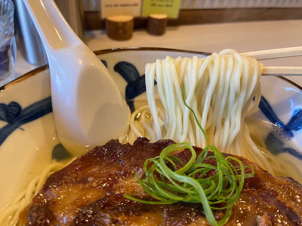程なくして提供された「鯛煮干の塩そば」 まず目が行くのは綺麗に揃えられた麺線の上にドカンと鎮座する具の巨大なソーキだ。 鯛の煮干しを使った淡麗塩スープはふんわりと鯛出汁が広がる優しい味わい。 旨味と一緒に微かに感じる柑橘系の風味が清涼感を演出。