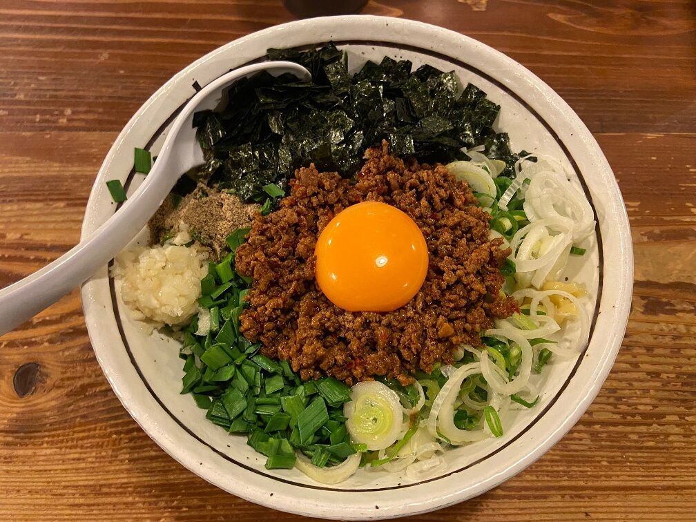 元々「台湾まぜそば」は激辛の「台湾らーめん」の汁無し仕様で辛さの強いが、こちらのは辛さが控えめで出汁の風味と甘じょっぱいタレの味が前面に出されている。 卓上に置かれたタバスコを入れれば辛さが増せ、特製のお酢入れればマイルド味に調整できる。 もちろんニンニクも効いておりパンチ力があり、「三河屋製麺」の太縮れ麺に卵黄が絡んでクリーミーでもある。 麺を食べ終えたら残ったタレと具に無料で出される追い飯を投入。