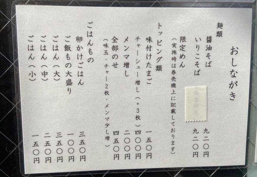 主なメニューは「醤油そば」「いりこそば」で、数量限定だった「いりこそば」は限定解除になっており、訪問前から決めていた「いりこそば」をトッピング全部のせで注文。
