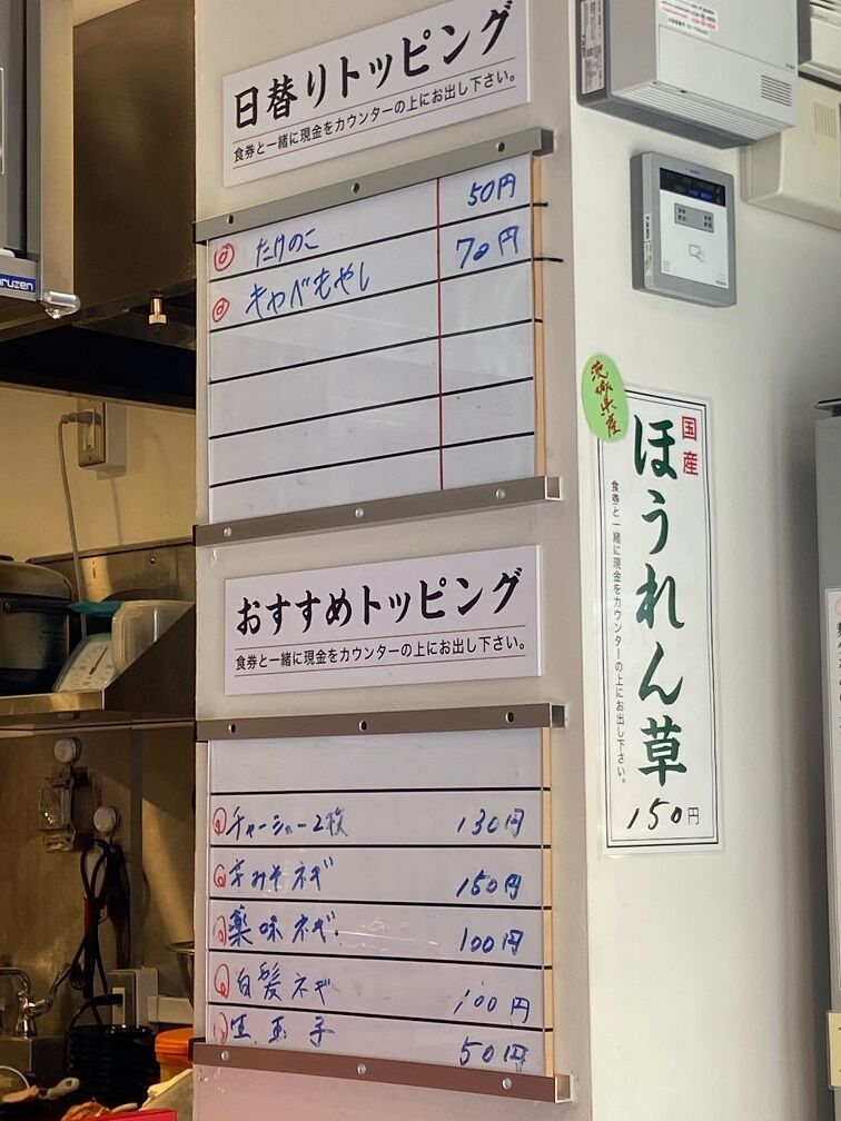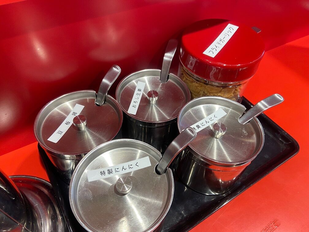 合わせる麺はもちろん家系御用達「酒井製麺」の平打ち中太ストレート麵。 個人的に家系の麺はカタよりも普通かヤワが好みなのだが、御用達麺はスープとの相性良さはさすがだ。 ローストされたチャーシューは噛むほどに燻製香と旨味が味わえ、ほうれん草と海苔にもこだわりが感じられる伝わってくる。 途中から卓上に置かれた様々なアイテムでの味変もお楽しみのひとつ。