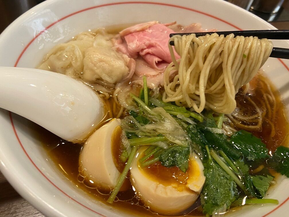 合わせる麺は全粒粉細ストレート麺。 やや柔らかめの茹で加減でソフトな口当たりが和風出汁のスープと合っている。 低温調理されたチャーシュー・プリプリのワンタン・味付けしっかりの味玉ともに丁寧な仕上がりで美味。 独学でここまでの仕上がりは本当に凄いですね。 機会を作って「白」も食べに来なくては。