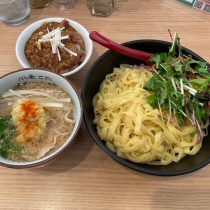 数年ぶりに新宿御苑前の『小麦と肉 桃の木』に訪問。こちらは女性店主と女性スタッフのみで営業している「我武者羅」グループのつけ麺専門店。基本メニューの「背脂生姜醤油」と「ミニ生姜カリーテール丼」を注文。程なくして着丼。 和風醤油がベースのつけ汁にはタップリの ...